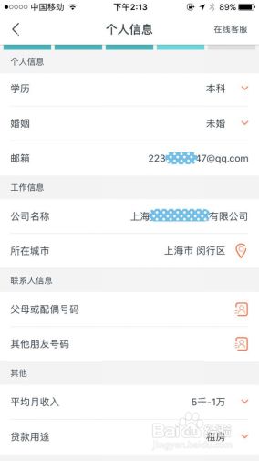 在个人信息页面,输入学历、婚姻状况、邮箱、公司名称、所在城市、父母或配偶号码、其他朋友号码、平均月收入、贷款用途等信息后,点击下一步。