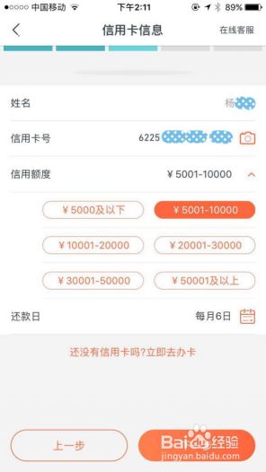信用卡信息一栏中填入你的姓名、信用卡号和信用额度,点击下一步。