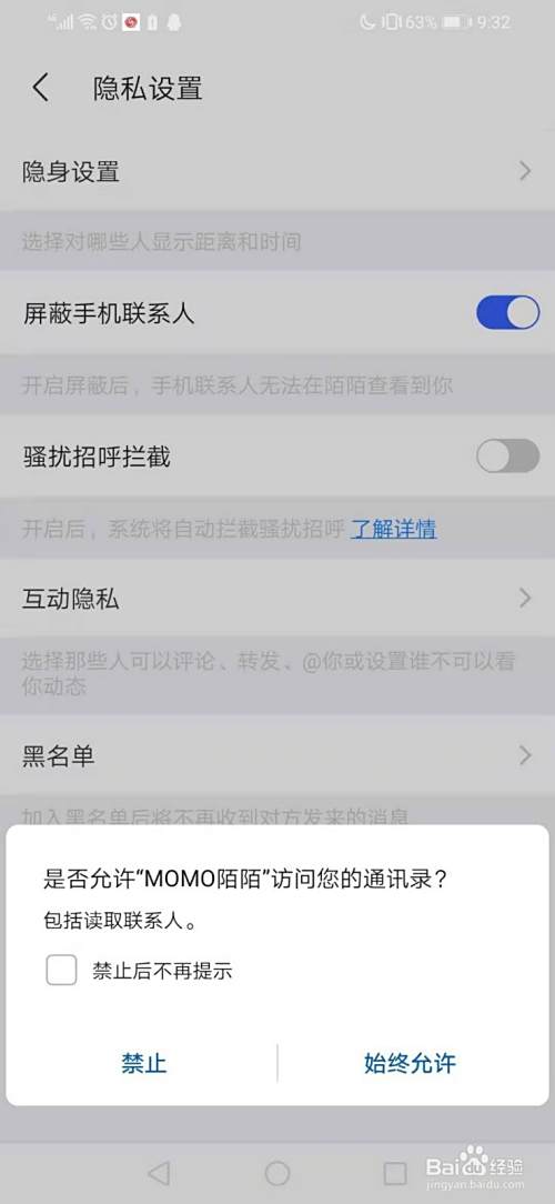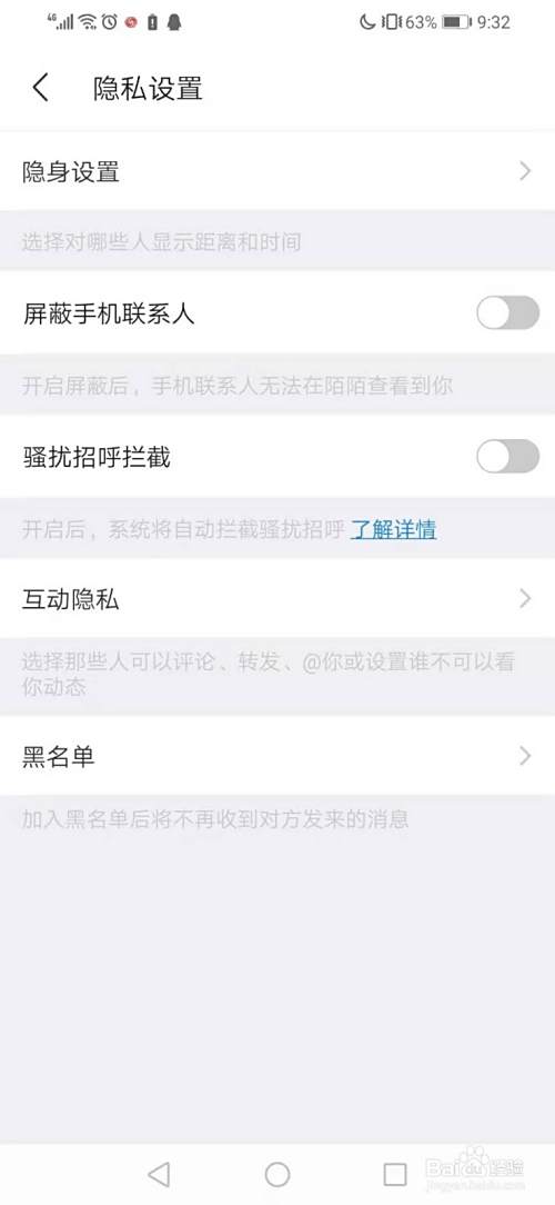 在这里你可以看到一栏写着“屏蔽手机联系人”,因为你认识的玩陌陌的一般你都会有号码,从这里就可以完全屏蔽掉他们。