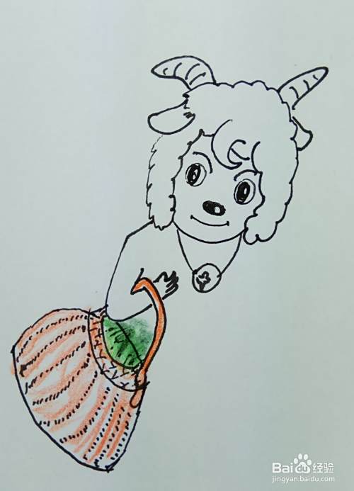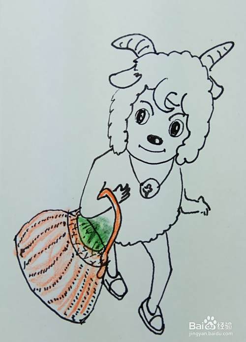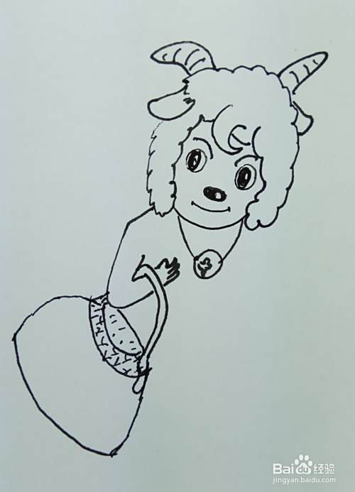 再用线条和曲线画出喜羊羊的身体部分,它正挎着篮子,在地上走着,修饰一下细节,简笔画就画好了。