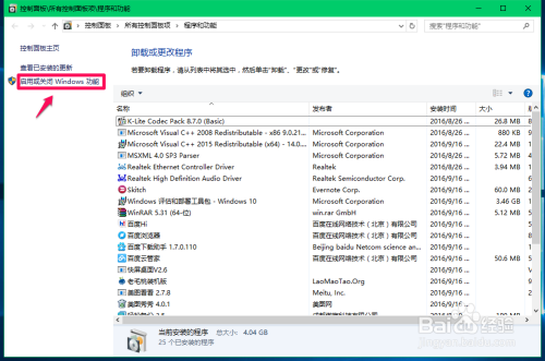 在程序和功能窗口,点击窗口左侧的【启用或关闭Windows功能】;