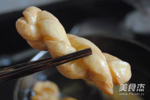 10加热到8成热时,放入麻花胚,直到浮起,要用筷子小心翻面