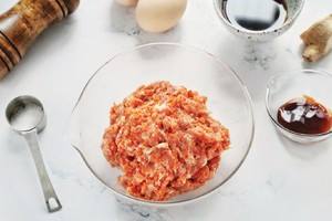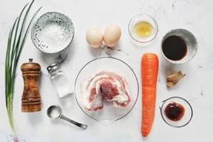 胡萝卜去皮切成碎丁,与五花肉剁在一起成糜状。