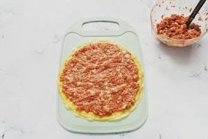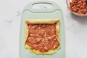 煎好的鸡蛋皮晾凉,均匀铺上拌好的肉馅。