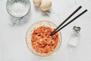 胡萝卜肉糜依次加入葱姜水、生抽,耗油,香油,胡椒粉,糖,盐拌匀,顺着一个方向搅拌至上劲,盖保鲜膜静置一小会。