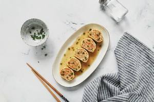 蛋皮左右两边向内折少许,然后再由上至下卷起,松紧要适中。