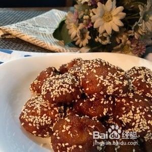 把炸好的果子放入漏勺滤去余油,撒上香酥芝麻粒,抖匀;