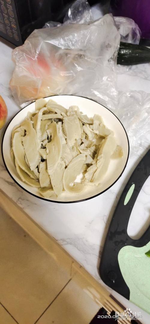 首先准备面筋一份,清水洗净,然后将面筋切成大小均匀的薄片。