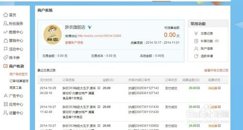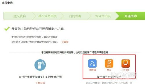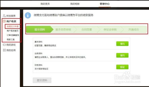 进入微博主页的管理中心,如下图有一个微博支付申请,把这些资料都填完,等待审核。审核通过后会让你下载一份合同,下载下来填完一式两份,按照给你的地址邮寄过去。那边收到后就会给你开通,然后在邮寄一份合同给你。 保证金:公司注册资金百万级别的,就免保证金的。最后就开通了微博支付。(买家付给你的钱,会直接打到你支付宝上面)