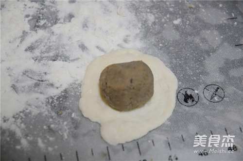6将小剂子稍微按扁,包裹上低速豆脂喝五沙馅
