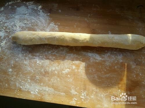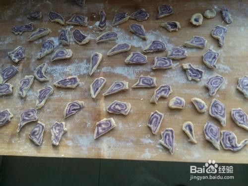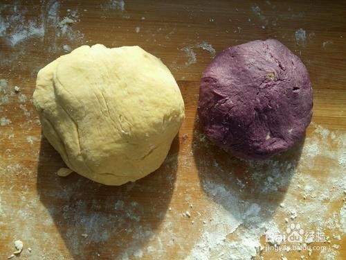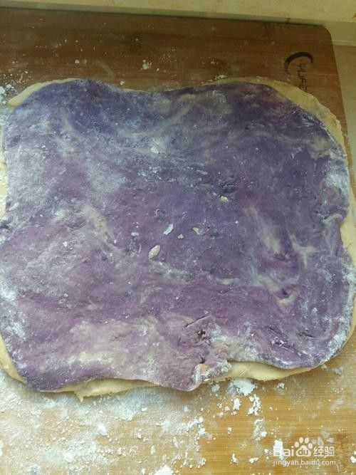 醒好的面好撑擀成大饼形状,紫薯的放在红薯面的上面,卷起来
