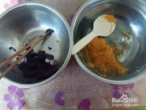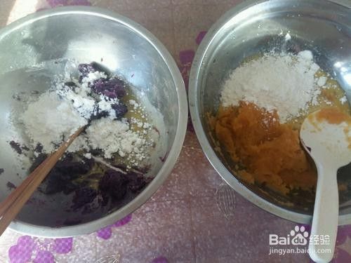 把鸡蛋分成两份分别放到红薯和紫薯的碗里,再放入面粉,这里也可以加糖,和牛奶,搅拌均匀