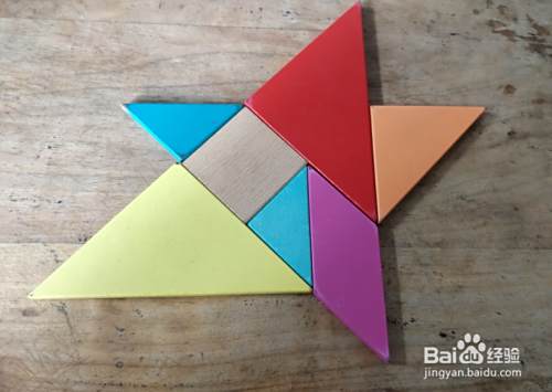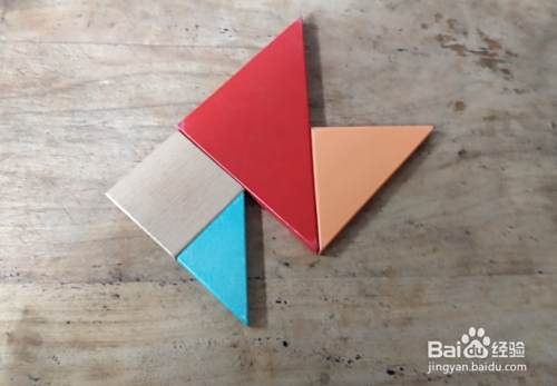 摆上黄色三角形,放在正方形左侧挨着,如图。这样就拼组好了。