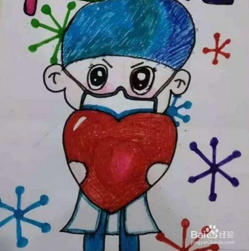 一个小朋友戴着一个大大的口罩,他有一颗红红的心;这颗红心代表对武汉地区的祝福,希望武汉的疫情抓紧过去。