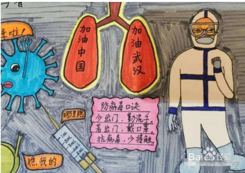 图片的正中间画上两片肺,左侧画上可怕的病毒,针管,右侧是医生,肺上写上武汉加油,中国加油。