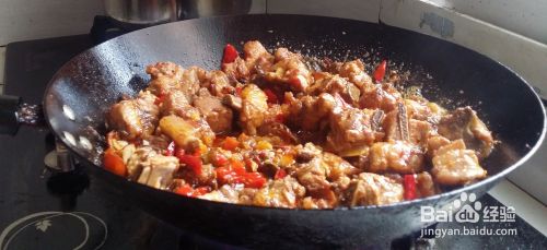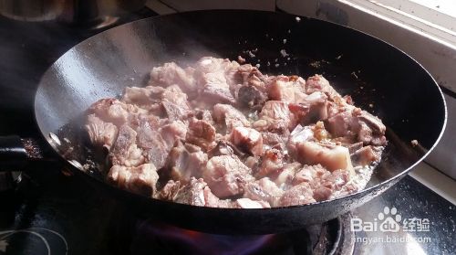 锅中倒入多点的油,过10秒后放入一些老姜进去,再把排骨倒入锅中翻炒,大火炒15分钟左右,排骨呈红色就差不多了。