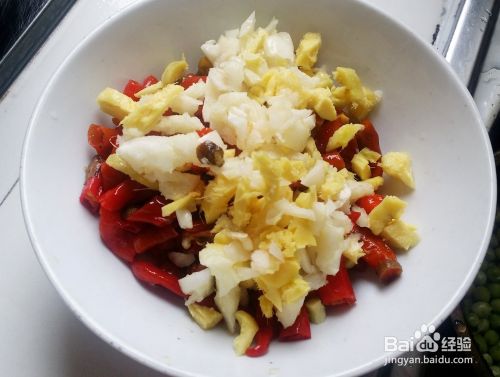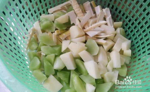 把主料和辅料洗净,切好,分别装入漏盆和碗中,如下图所示: