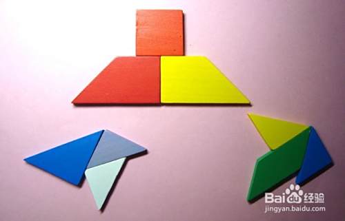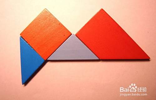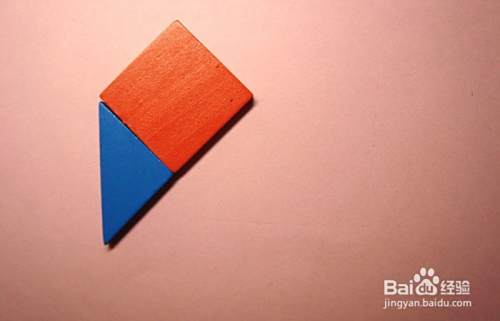 接着,用紫色的三角形板与红色梯形连接,并摆放在红色正方形板的右边,拼接位置,如下图所示。
