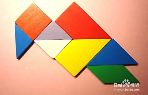 接着,用绿色的平行四边形板与蓝色三角形板连接,并摆放在橘色梯形板的右边,作为小鹦鹉的尾巴图形,拼接放位置,如下图所示。