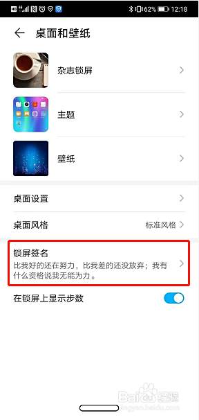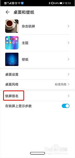 点击桌面和壁纸进入桌面和壁纸界面,找到【锁屏签名】。