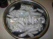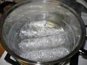 烧开一锅水,水的多少一定要淹过鸡肉卷。水开后放入鸡肉卷,水的温度保持在开水不滚的状况下,开小火慢慢浸煮20分钟左右。然后关火后再焖5分钟,这样肉质会更嫩。