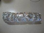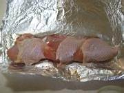 腌好的鸡腿肉再翻转过来,鸡皮在外。将鸡腿肉排放在锡箔纸上,卷起来这样鸡肉熟了以后就可以定型。