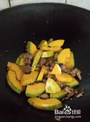 放入南瓜。鹅肉焖了3-5分钟之后,已基本熟了,但鹅肉本身比较韧,需要多焖一下,因此,鹅肉焖了3-5分钟后,再放入南瓜,盖上锅盖焖3分钟,如果锅中的水份不够,可以加入一些开水,以防南瓜在焖的过程中,因缺水而粘锅。