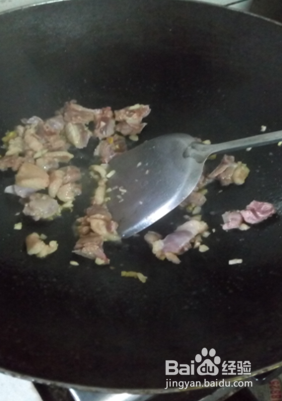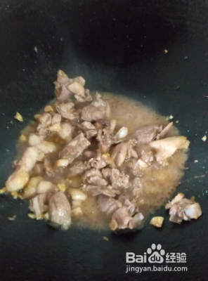 放入鹅肉。在姜蒜爆香之后,放入鹅肉,加入1勺米酒、适量酱酒,迅速翻炒一下,然后加入大半碗的水,盖上锅盖,让鹅肉焖3-5分钟。