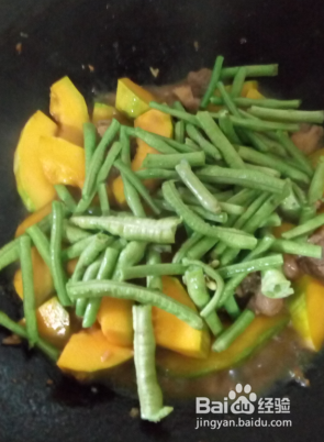 放入豆角。在鹅肉和南瓜焖的差不多熟的时候,再放入豆角,大火翻炒,期间可以再放入一些酱油调味。豆角炒熟后,关小火,放入一些盐,再炒均匀即可。