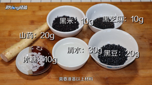 1需要准备以下材料,包括黑米10g、黑芝麻10g、山药20g、清水30g 、黑豆20g、冰糖10g。