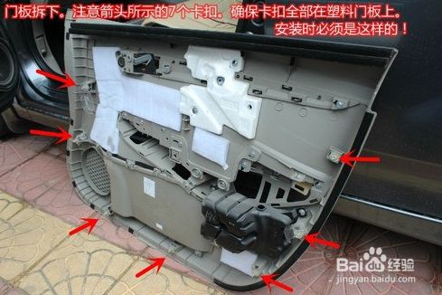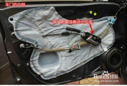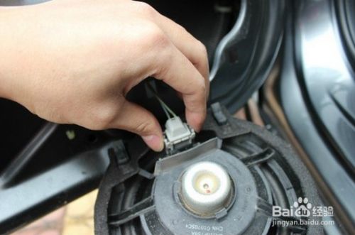 卸掉门上的喇叭,这里卸掉喇叭的目的是为了取出喇叭的线头,方便后下一步的并线工作。拆卸喇叭的时候要注意用手托住喇叭,避免一不小心喇叭掉落摔坏或者喇叭掉落的时候拉断连接线。