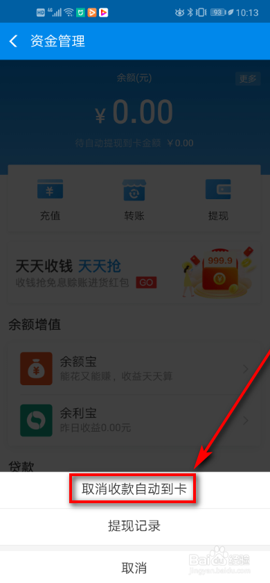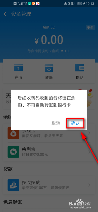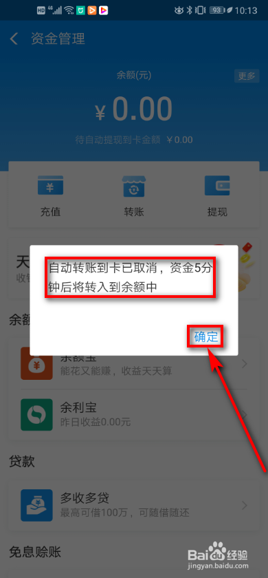 7、系统跳出提示自动转账到卡已取消,点击下方确定。