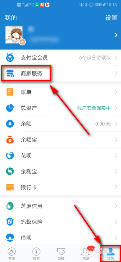 界面切换,点击右下角我的图标,点击第2个商家服务。