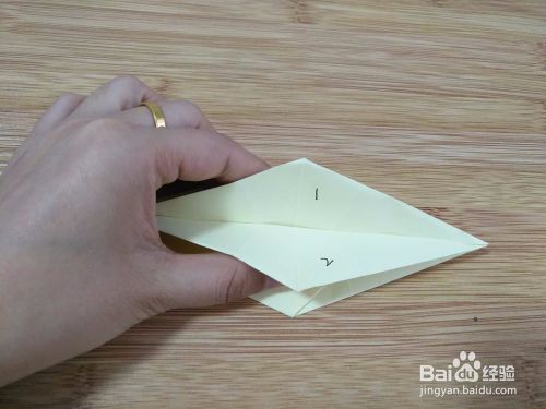 第七步:把上面得到的形状两面的边翻下,并把标注1和2的两部分合并在一起。
