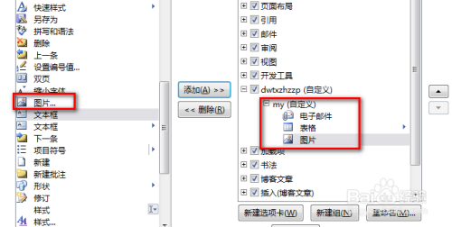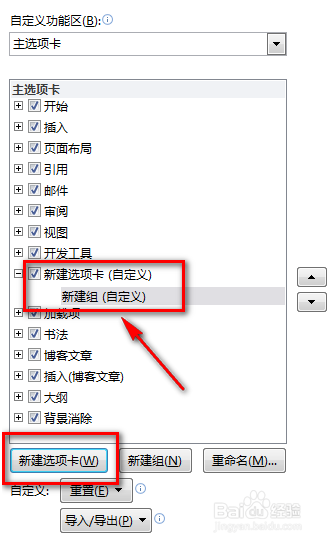 在右侧的下方找到 新建选项卡,这时上方会出现“新建选项卡”和“新建组”
