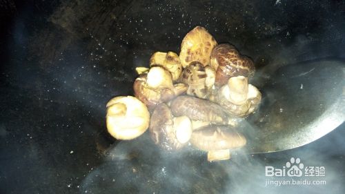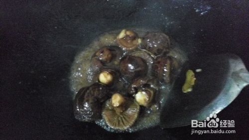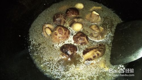 待香菇翻炒变色后,加入香菇水,以浸过香菇为准。再将火调至大火,汤汁开后关小火。
