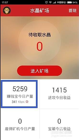 在“水晶矿场”主界面,点击“赚钱宝今日产量”按钮进入赚钱宝监控界面。