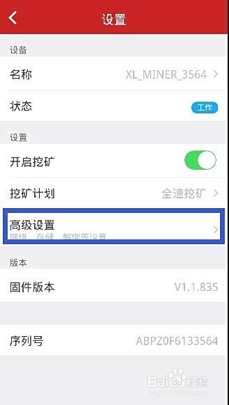 待水晶矿场固件版本升级到最新版本之后,点击“高级设置”项进入详细设置界面。