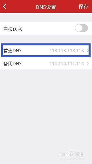 待“自动获取DNS”功能关闭后,点击“首选DNS”项,将进入首选DNS编辑界面,如图所示: