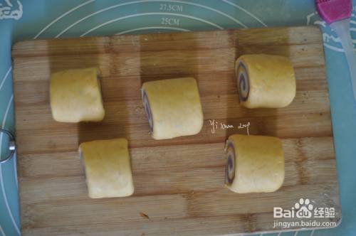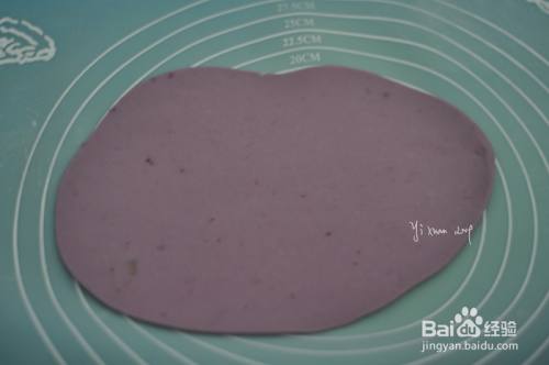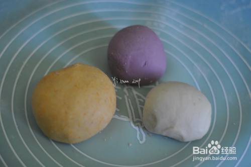 中筋面粉50g+紫薯泥50g +酵母粉0.5g+白糖5g+适量清水揉成紫色面团
