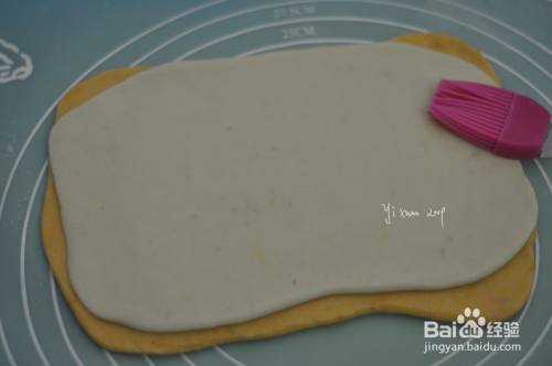 南瓜面片在下面,铺上白色面片,面片之间刷一层食用油