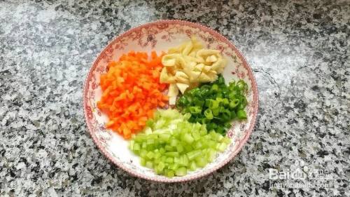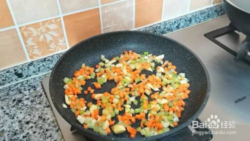 锅里加适量油,放入蒜末爆香,再倒入芹菜碎和胡萝卜丁翻炒