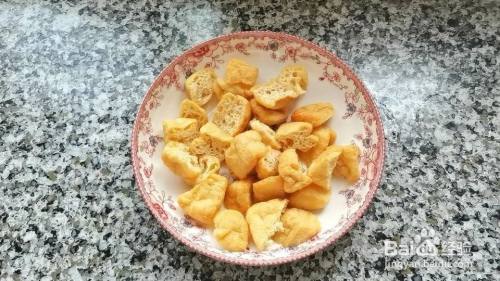 豆腐泡可以自己制作,也可以买现成的,清洗干净,攥干水分,把豆腐泡改刀,切成两半,能更好的入味
