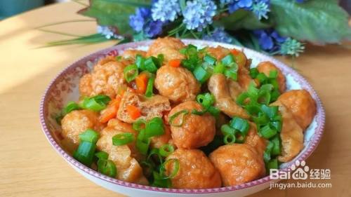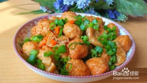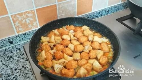 下入豆腐泡翻炒均匀,下入炸好的肉丸子,再倒入调好的料汁,炖煮至汤汁黏稠,撒层葱花翻炒均匀就可以出锅了