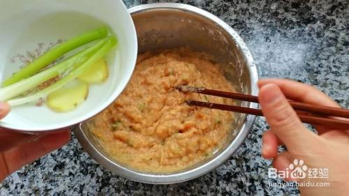 少量多次加点葱姜水,朝一个方向不停的搅拌上劲,大概七八分钟就可以了。