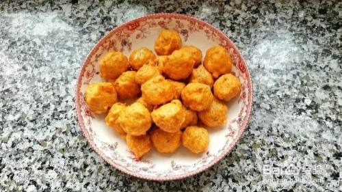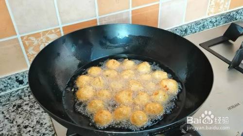 锅里加适量油,油烧至五成热,调小火,下入丸子,炸至定型,稍微的翻动开来。全程小火炸,中途多次翻拨,使其均匀受热。炸至金黄捞出备用