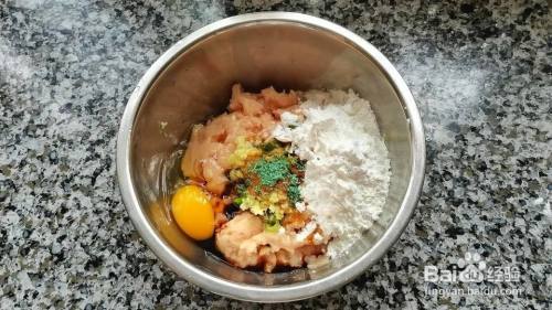 洗净的鸡胸肉绞成肉泥,不怕麻烦的可以自己剁,自己剁的肉馅口感更好,加肉馅三分之一量的玉米淀粉,加适量盐、鸡精、生抽、十三香、柠檬汁(或者料酒)、适量葱花姜末,再打入一颗鸡蛋充分搅拌均匀