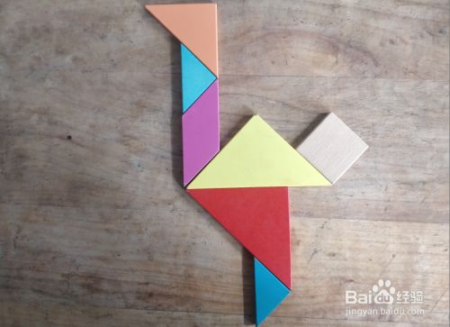摆上中号三角形,放在上侧小三角形的上面挨着,直角在右侧上端,如图。鸵鸟就拼组好了。