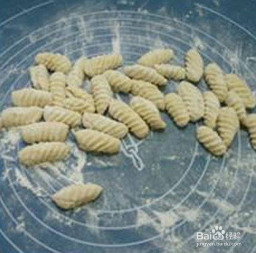 随后,取一小块面团放在寿司帘上用大拇指按压成螺丝形