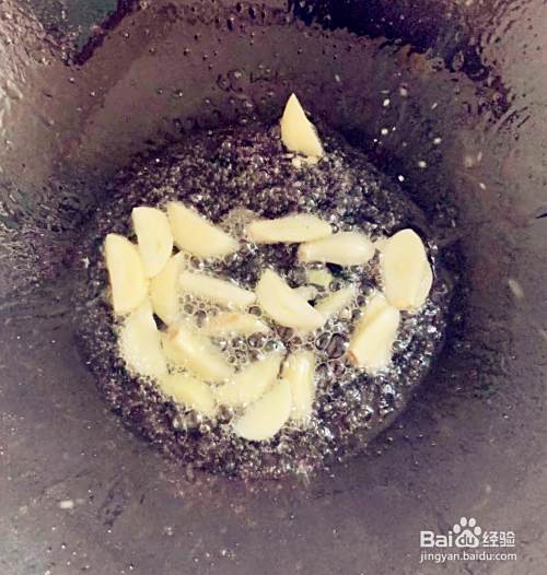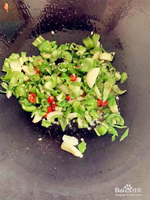 大火,锅中倒油,待油烧热后,加入大蒜爆香,然后加入切好的螺丝椒、指天椒,进行翻炒。